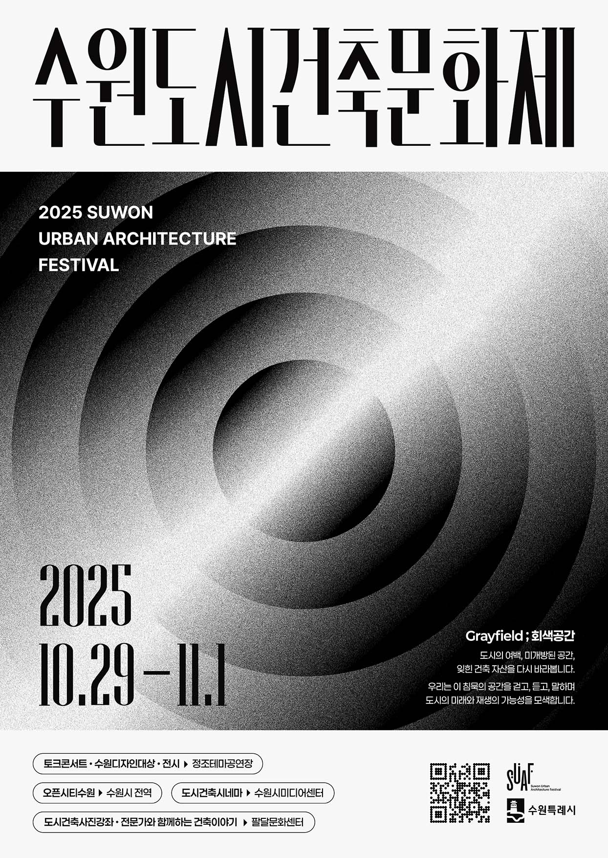 ○ 기 간: 2025. 10. 29.(수) ~ 11. 1.(토) [4일간] ○ 장 소: 정조테마공연장, 수원시미디어센터, 팔달문화센터 등 ○ 프로그램: 오픈시티수원, 토크콘서트&수원디자인대상 시상식, 도시건축 시네마, 도시건축 사진강좌, 전문가와 함께하는 건축이야기, 전시(대학생 국제워크숍 작품전, 건축사 사진전) ○ 종합안내: https://litt.ly/suaf.kr