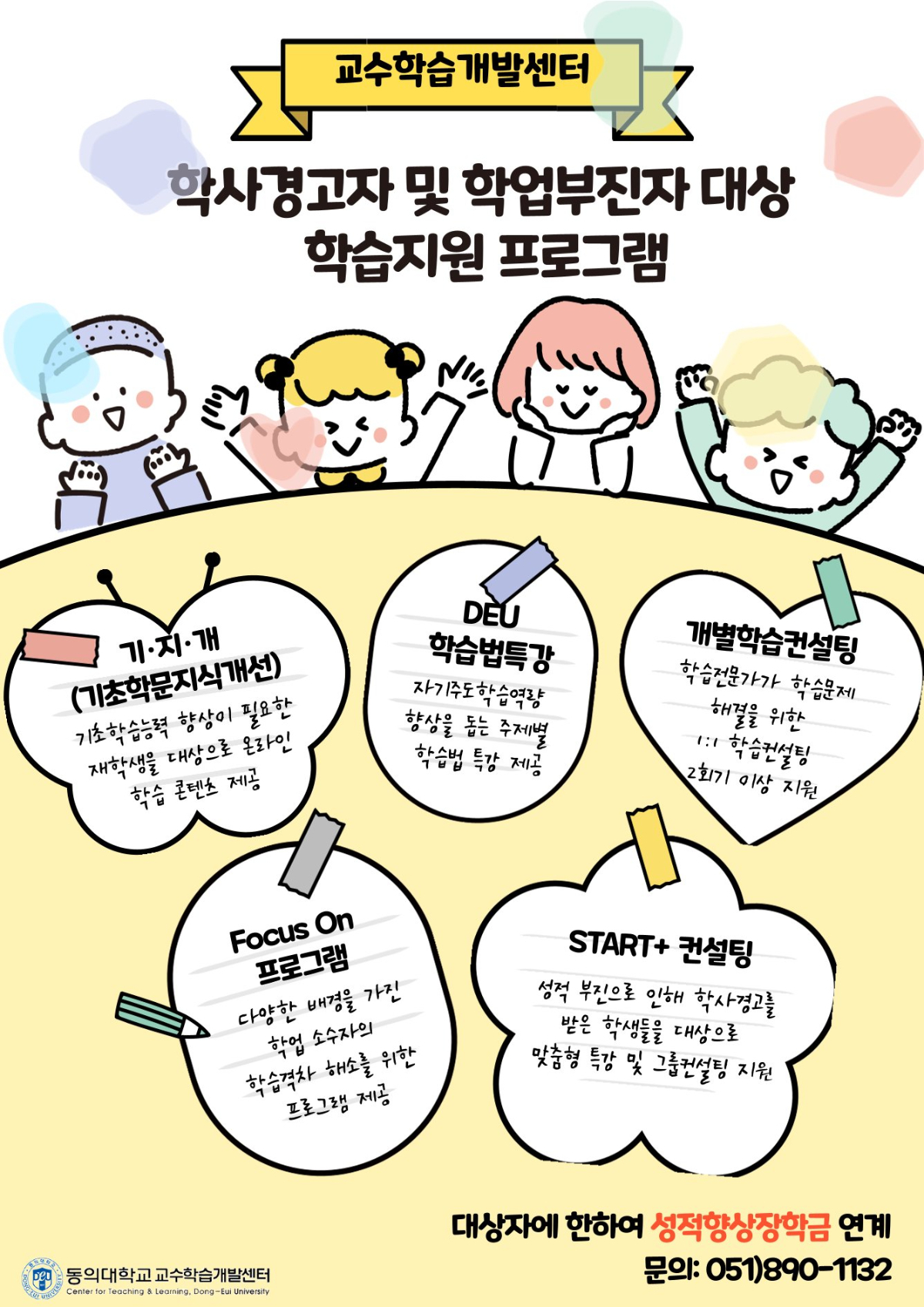 2025-2학기 교수학습개발센터의 학사경고자 및 학업부진자 대상 학습지원 프로그램을 다음과 같이 안내하오니 많은 학생의 참여바랍니다.