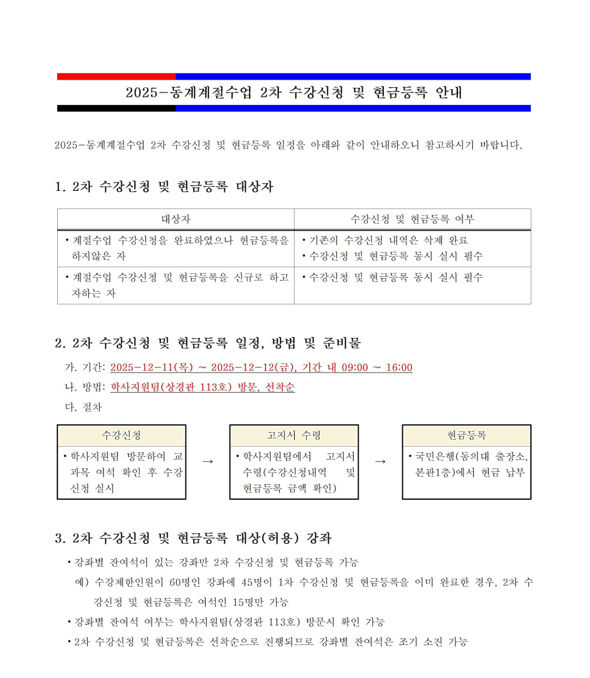 2025-동계계절수업 2차 수강신청 및 현금등록 안내