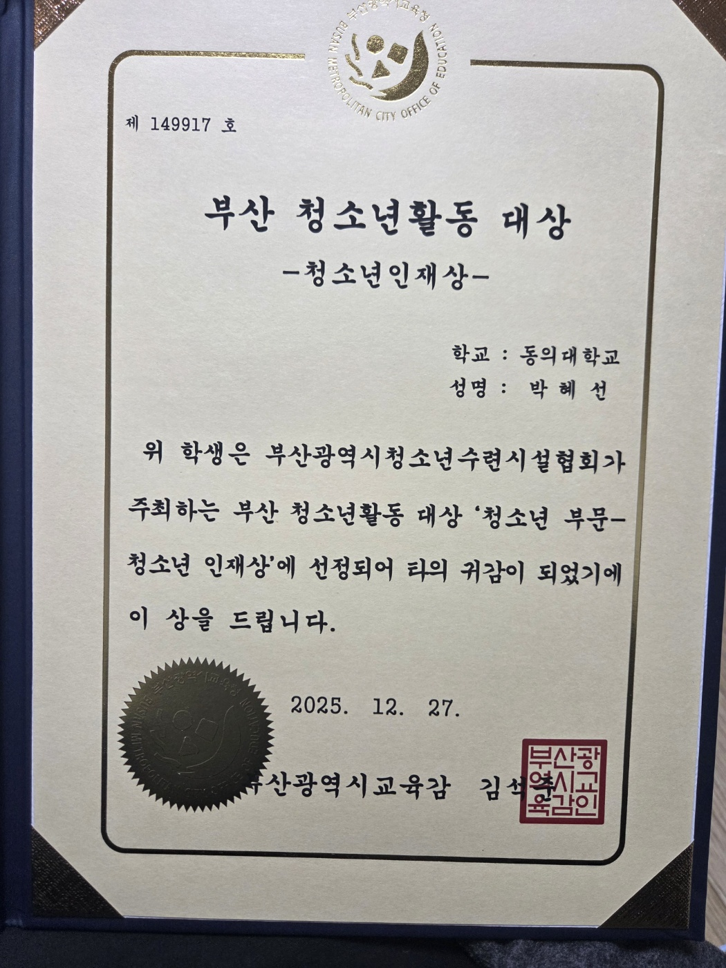 [2025]2025 부산광역시 청소년 활동 대상 교육감상 시상 (평생교육 청소년상담학과 23학번 박혜선)