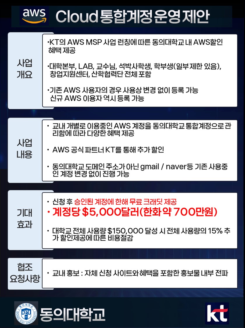 가. 지원사항: 학내 구성원들이 개별로 이용중인 AWS계정을 동의대학교 통합계정으로 관리하고 AWS관련 다양한 서비스를 일정기간 동안 무상 제공