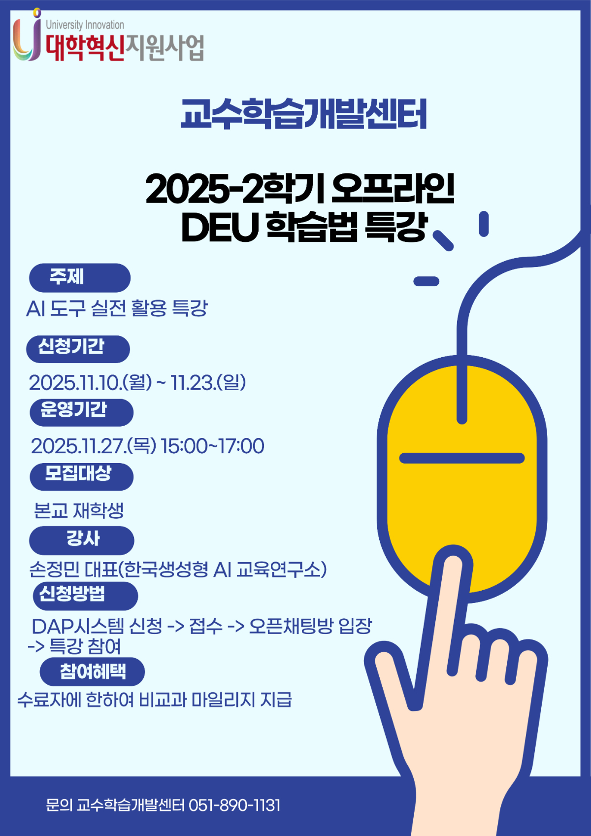 [안내][대학혁신지원사업] 2025-2학기 오프라인 DEU 학습법 특강 신청 안내